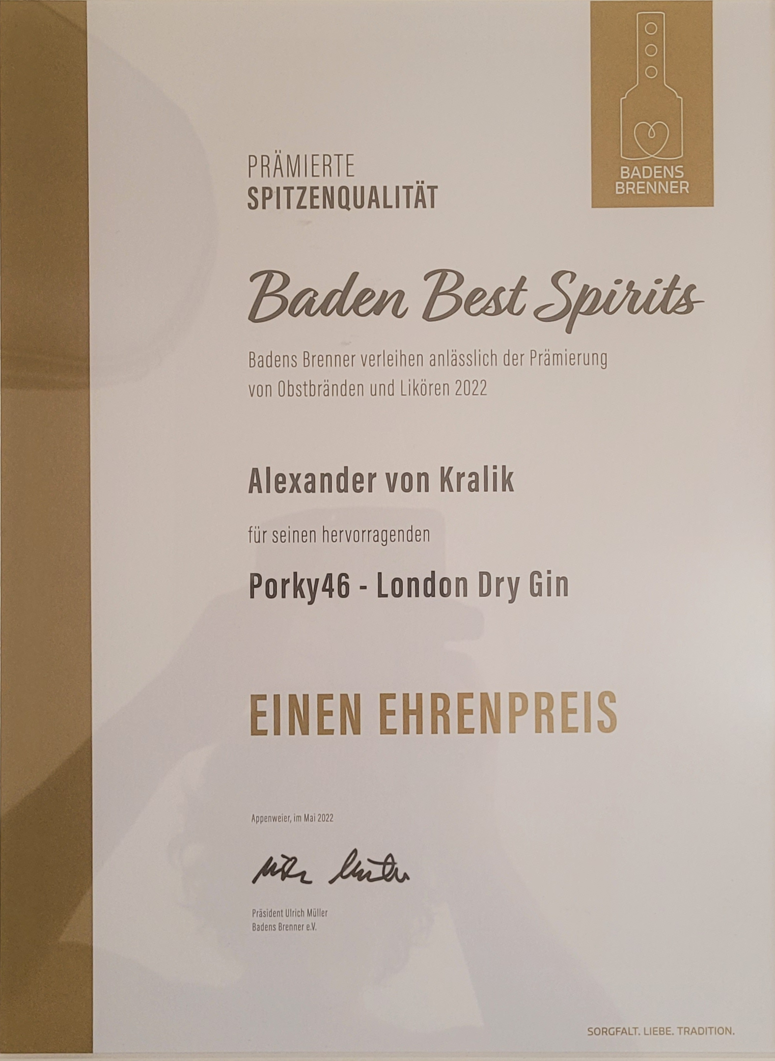 Porky 46 - London Dry Gin was recently awarded 2 times gold. In the process, Baden Best Spirits awarded an honorary prize for the Best Gin from Baden - the maximum number of points assessed by the judges. Porky46 is "very pure, varietal and perfectly harmonious".